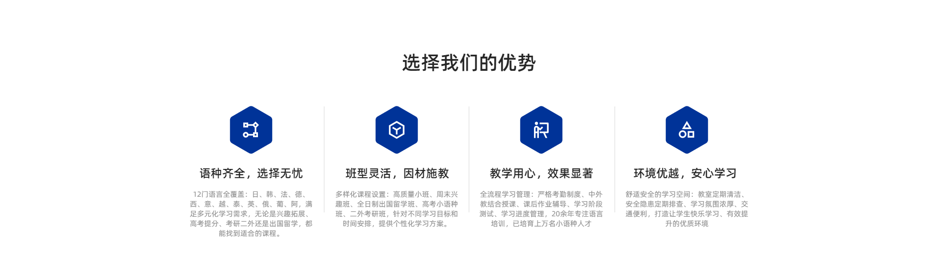 长沙二外小语种成立于2004年,是以日、韩、法、德、西、意、越、泰、英、俄、葡、阿为主的专业语种培训学校,专注于语言培训20余年。长沙二外小语种一直致力于以最优的教学品质、最舒适的学习环境、最负责的学习规划制定和跟进、最贴心的服务,帮助学生快乐学习、有效地获得提高。20余年期间,长沙二外小语种已经培育出了上万名的小语种人才。
